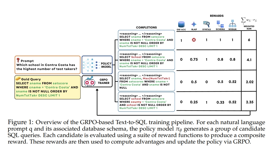 - 组相对策略优化(GRPO):为了有效整合多种奖励信号,论文采用了组相对策略优化(GRPO)算法。GRPO通过生成每个输入的多个候选SQL查询,并根据这些候选之间的相对表现来计算优势,从而为模型提供更丰富、更有效的反馈。