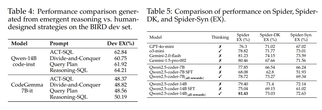 - 推理能力分析:通过观察模型在训练过程中推理风格的变化,发现模型能够自然地发展出更结构化的推理方式,从而生成更准确的SQL查询。此外,通过将模型的推理风格与人类设计的推理策略进行比较,结果表明模型自动生成的推理风格在性能上优于人类设计的策略。